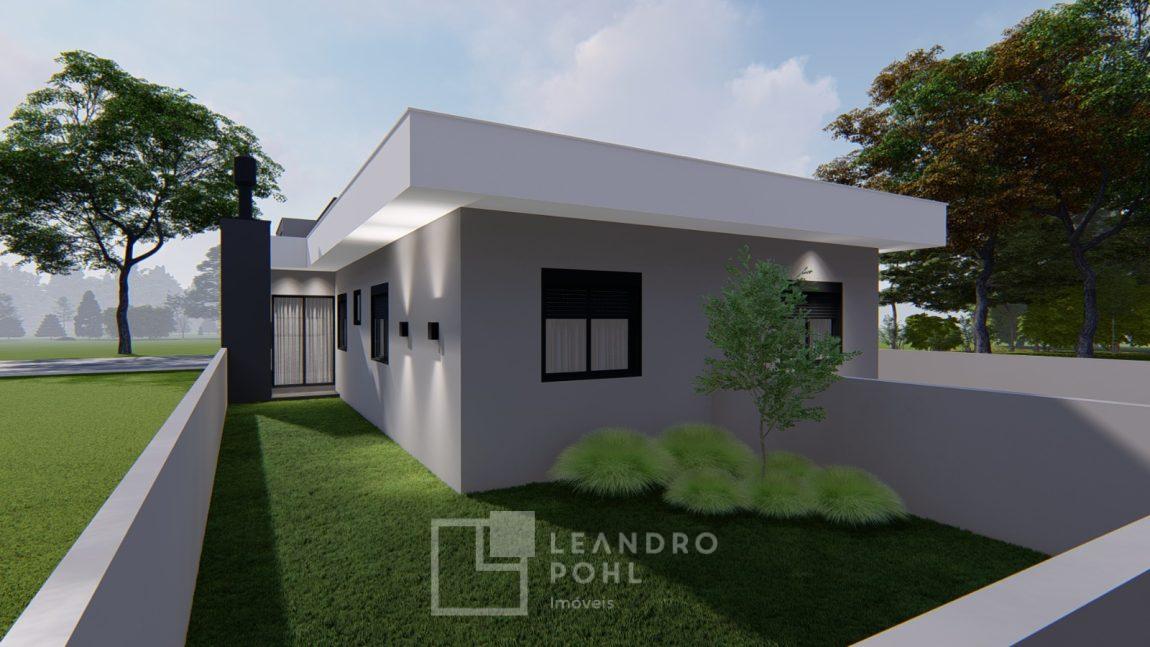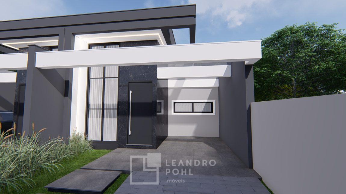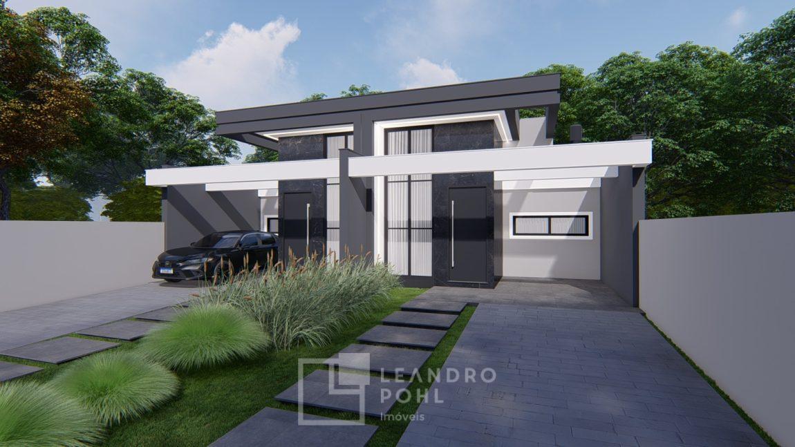Casa geminada com 69,94 m², composta por 3 dormitórios, Sala de estar, Sala de jantar, Churrasqueira externa, Cozinha, Lavanderia, 1 banheiro social, Garagem (possibilidade de 02 veículos um atrás do outro), Pé direito alto, Amplo pátio, divisas: Mureta na frente e fundos muro 1,6m, Frente: Gramado., Fundo: Coberto com brita., Trilhos: Concreto na rampa para o carro e pisantes até a entrada