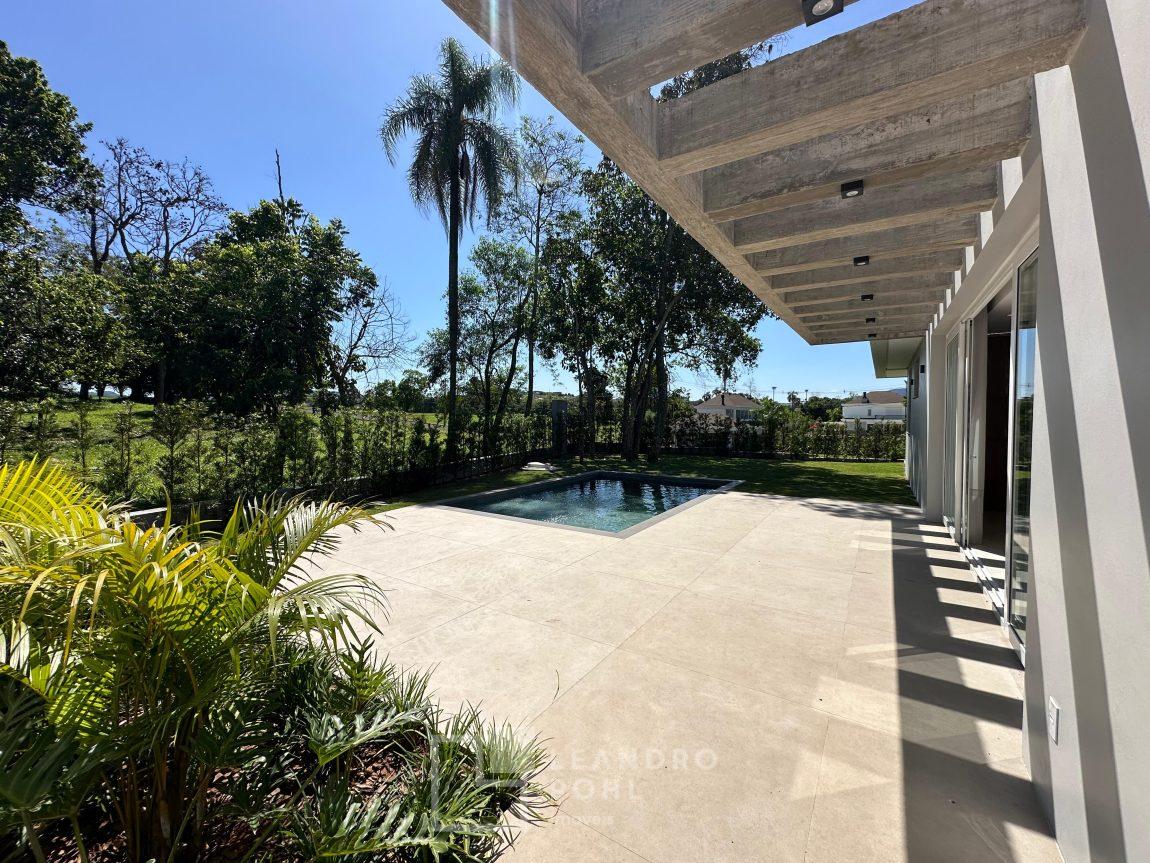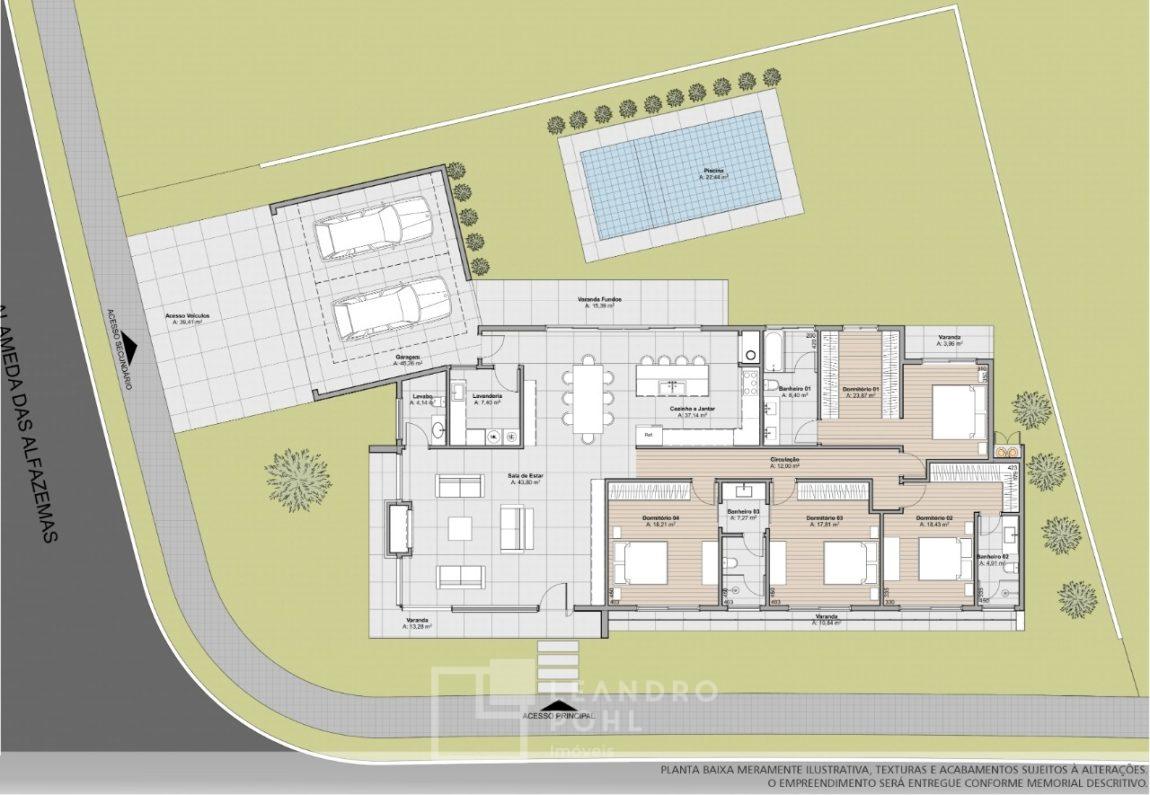 📐 Residência plana que conta com 342,42m² de área, distribuídos em 4 suítes (sendo 2 americanas), sala de estar, cozinha integrada, jantar, piscina, lavabo, lavanderia e garagem.;
