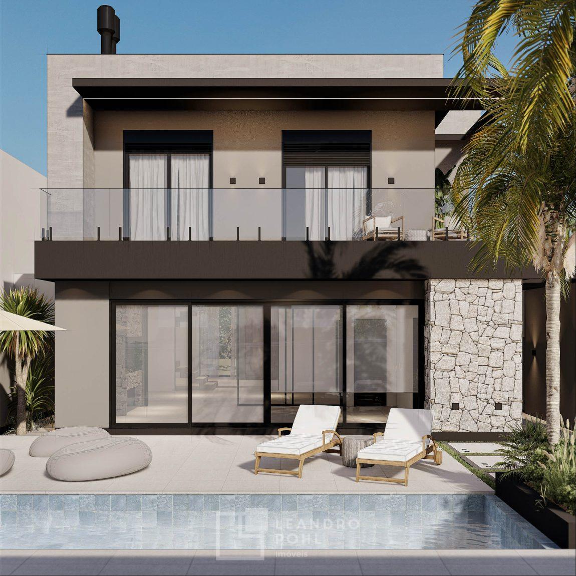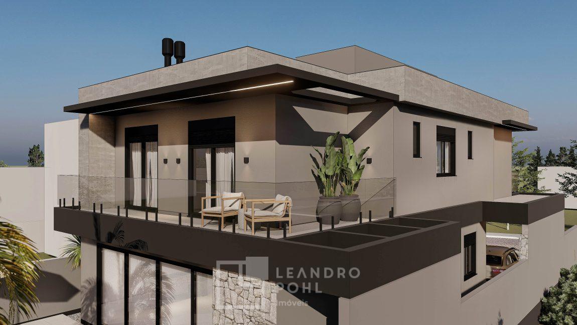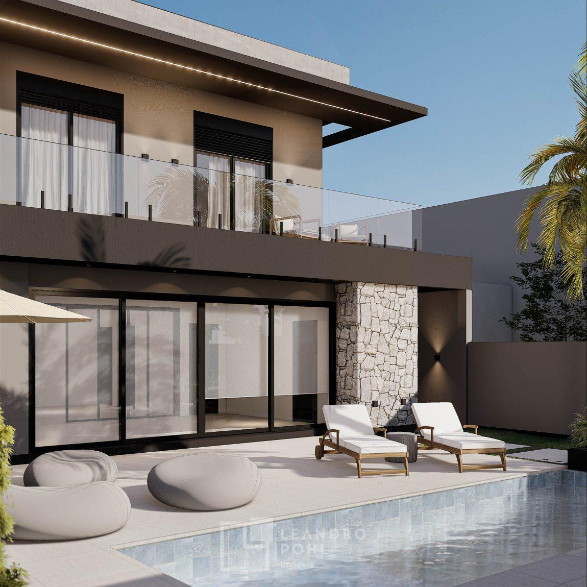 Com 04 suítes no pavimento superior, e 01 dormitório/office no térreo, espaço para home office, sala de estar com lareira, escada plissada, sala de jantar e cozinha integradas, ampla área gourmet com abertura para os fundos, lavanderia, depósito, espaço para armazenamento do gás de cozinha, banheiro social, lavabo, garagem aberta para 02 veículos com saída para os fundos, piscina em concreto com dimensões de 7,20x2,50m, pé direito duplo na sala de estar, dormitórios dos fundos com sacada. Revestimento em porcelanato e azulejos em tons neutros, laminado nos dormitórios do pavimento superior, esquadrias externas em alumínio preto, portas internas laqueadas, muros e cercas, acessos e rampa de garagem, massa corrida nas paredes, fita led da fachada, forro em gesso, esperas para automação, esperas para aquecimento.