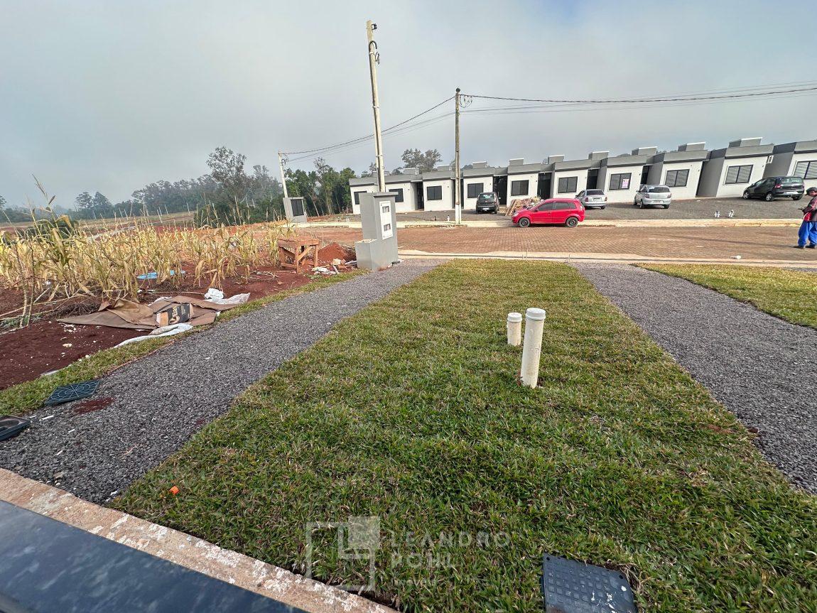 Casa plana 2 dormitórios, sala, cozinha e área de serviço conjugadas, em piso cerâmico, aberturas em alumínio, pátio frente e fundos, não cercada.
