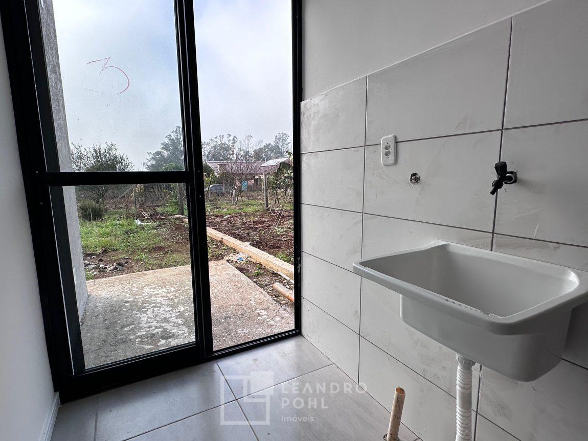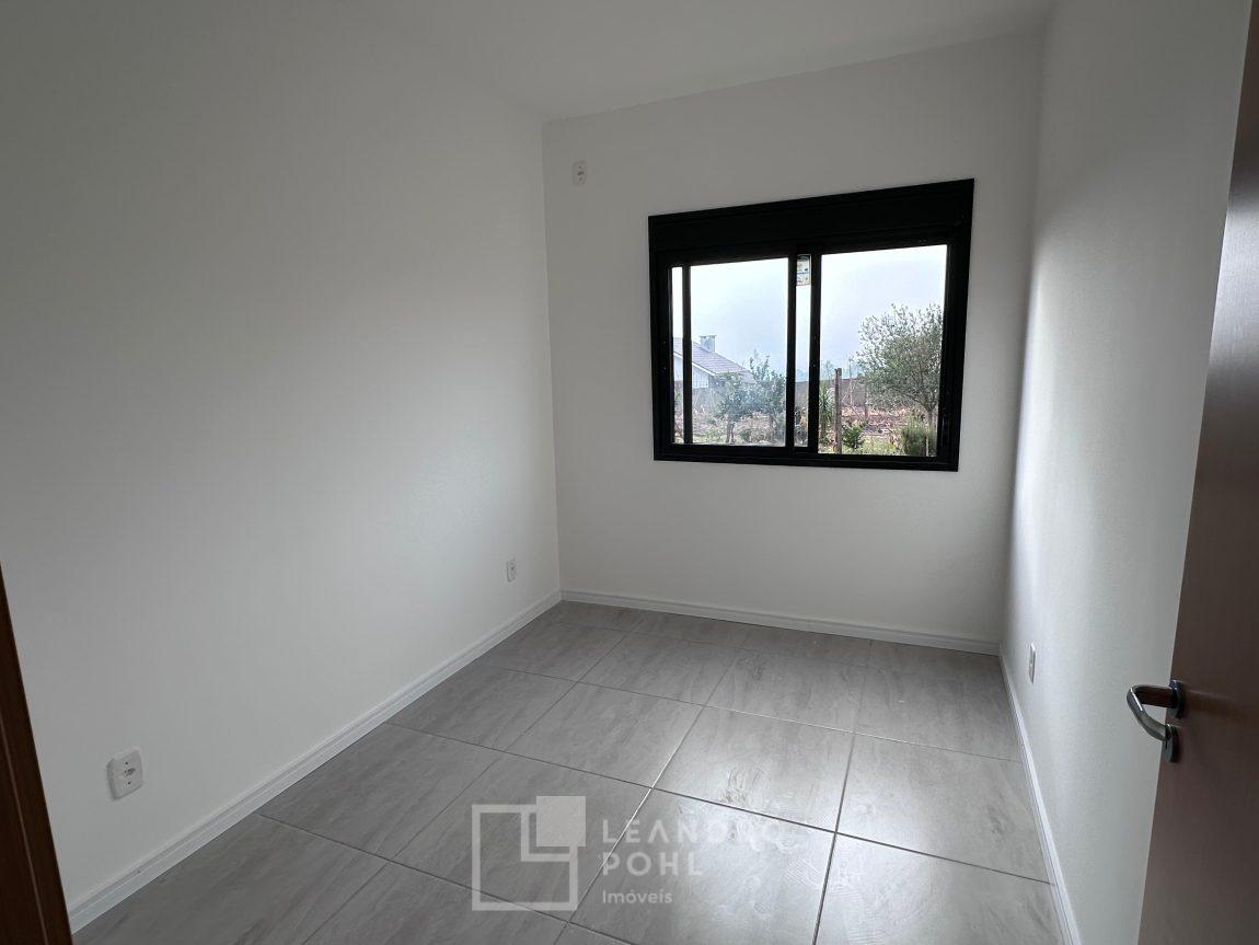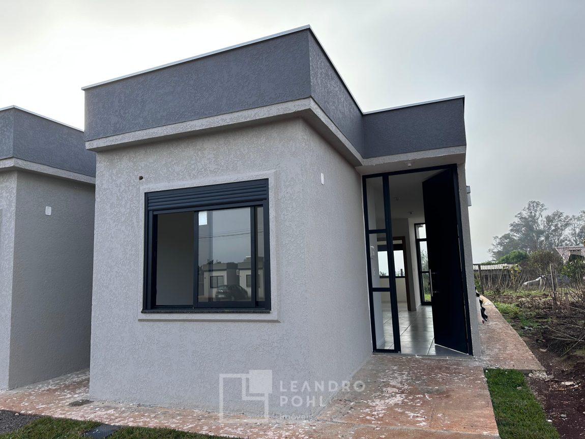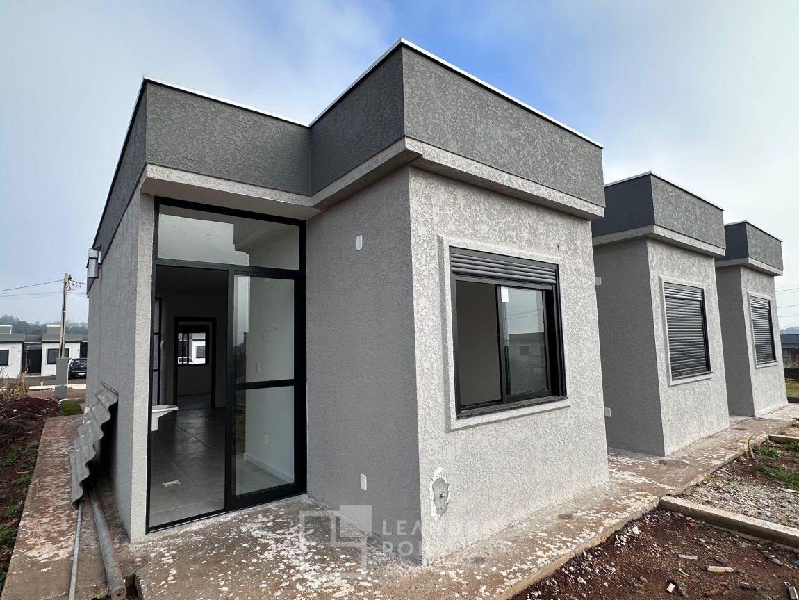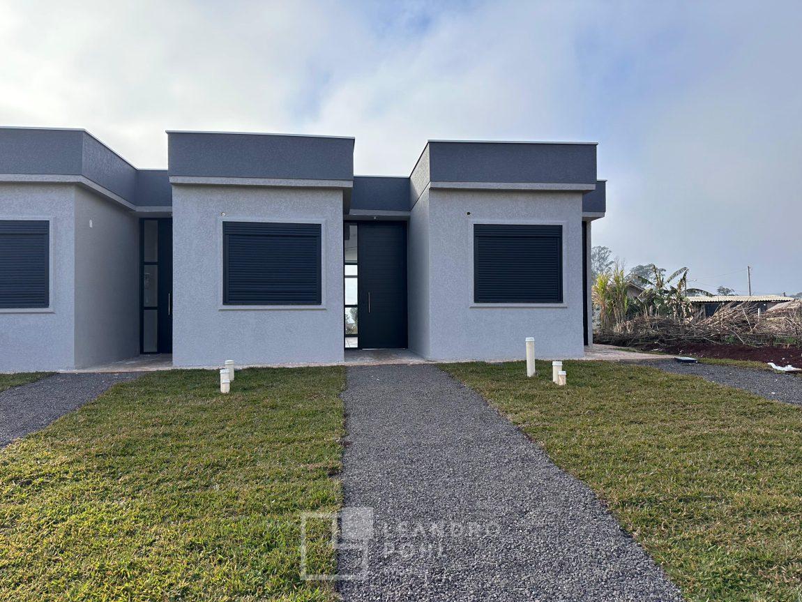 Casa plana 2 dormitórios, sala, cozinha e área de serviço conjugadas, em piso cerâmico, aberturas em alumínio, pátio frente e fundos, não cercada.