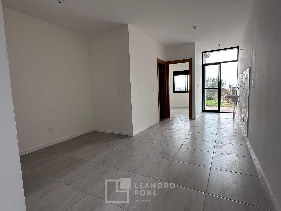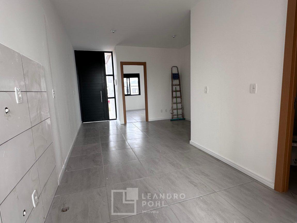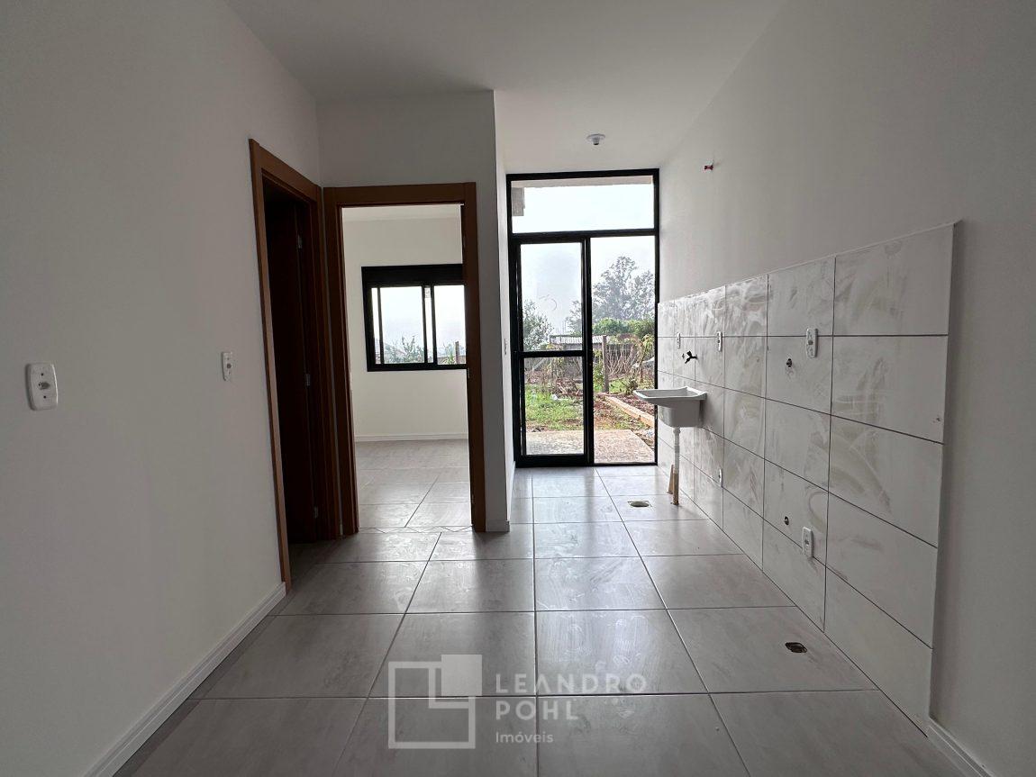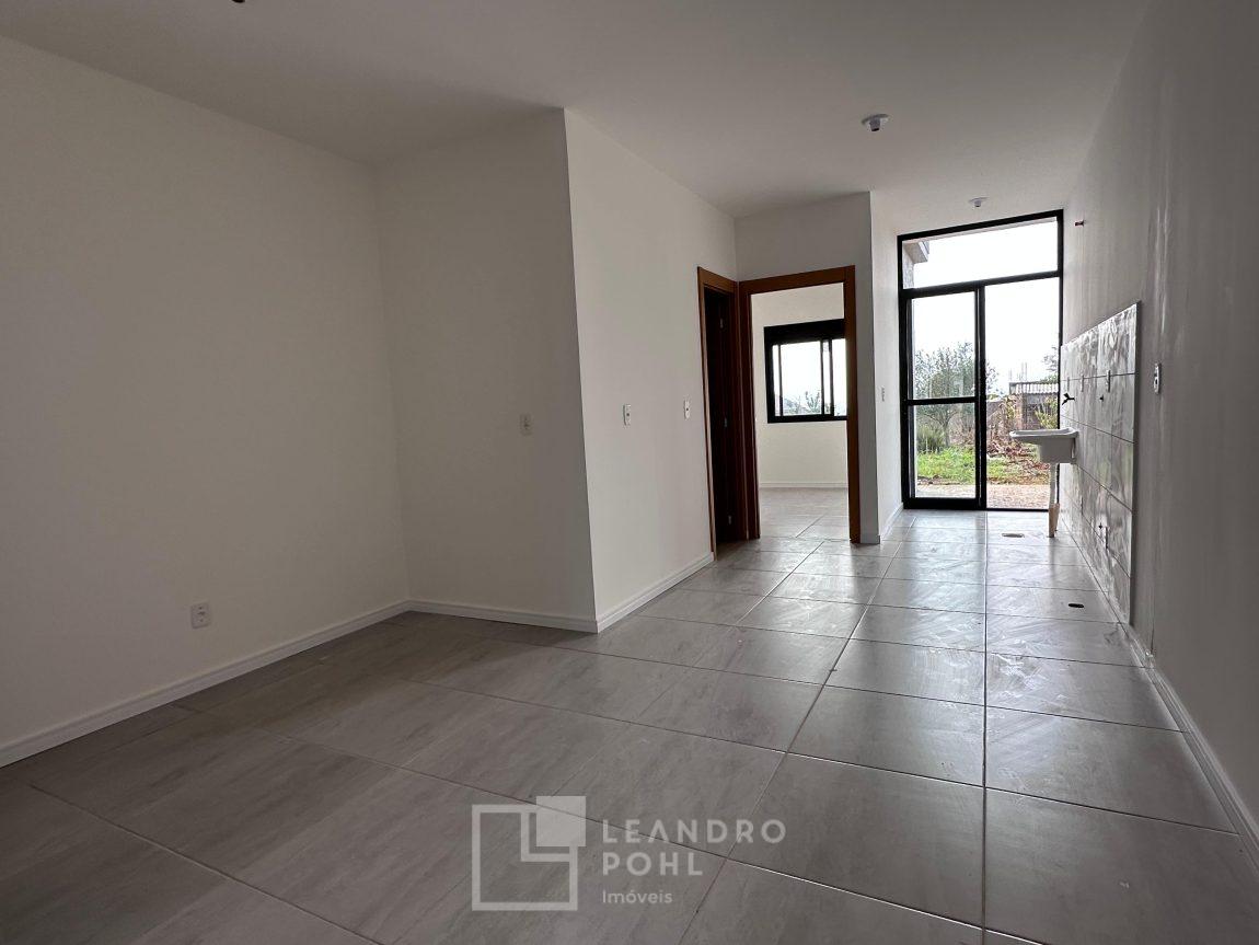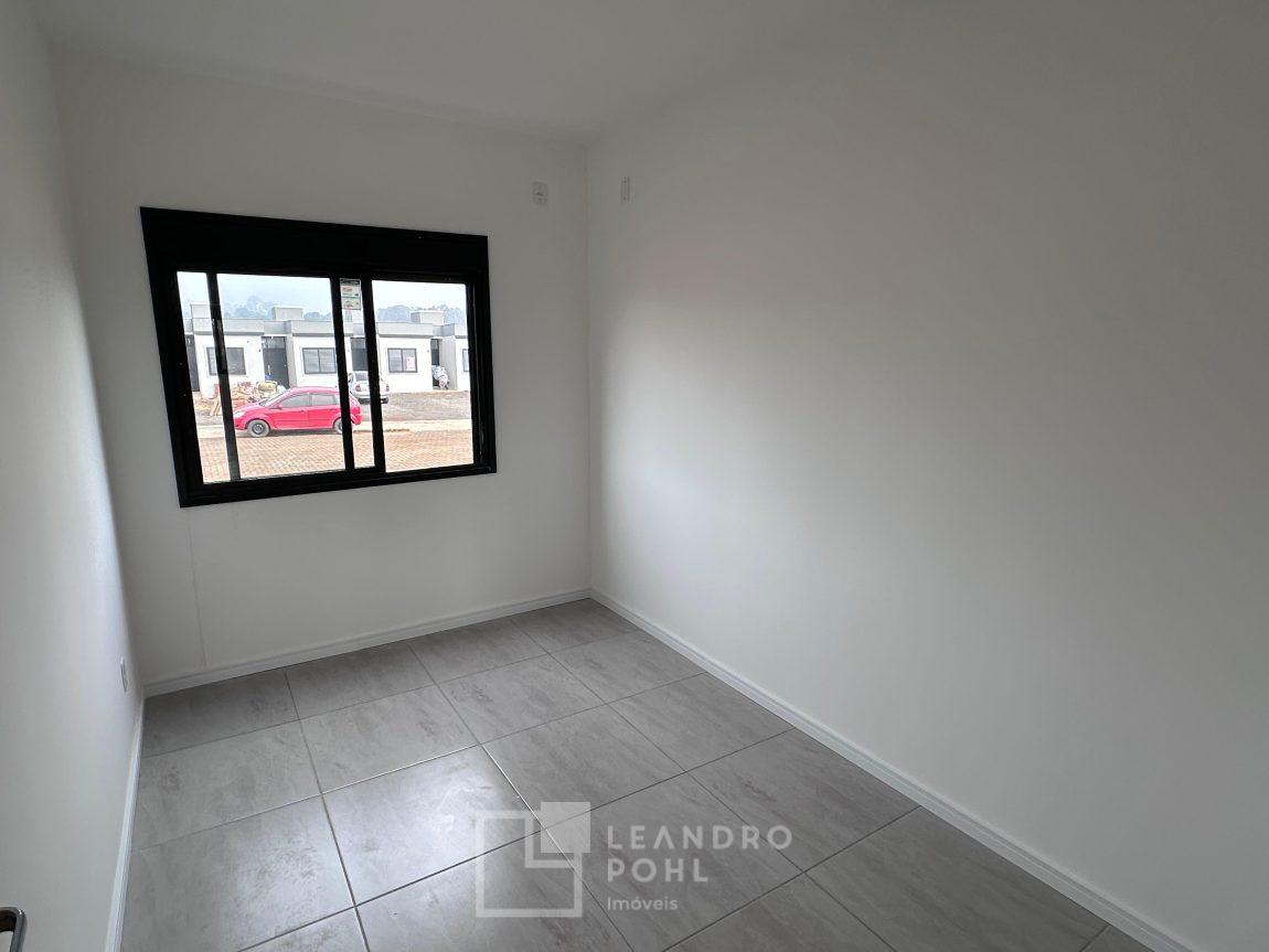 Casa plana 2 dormitórios, sala, cozinha e área de serviço conjugadas, em piso cerâmico, aberturas em alumínio, pátio frente e fundos, não cercada.