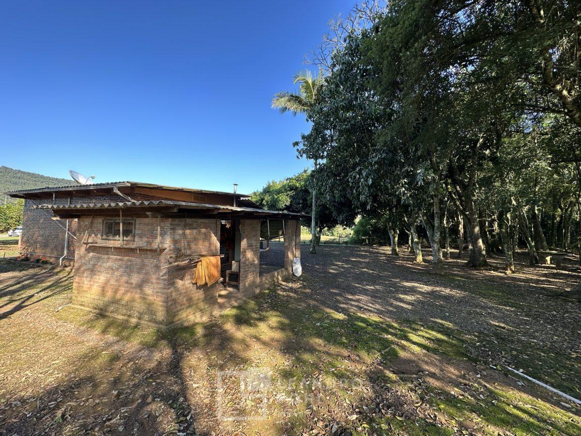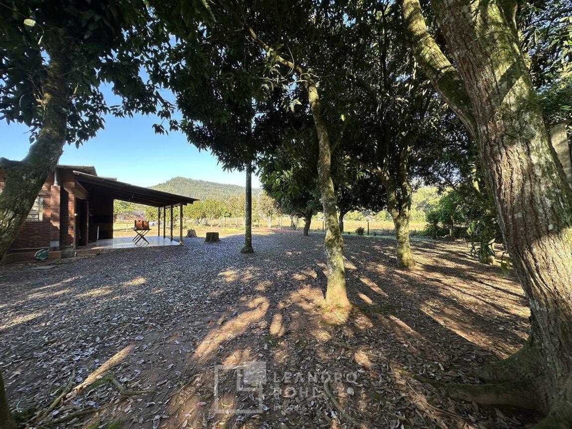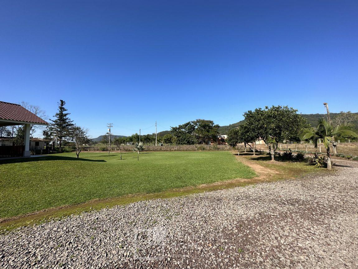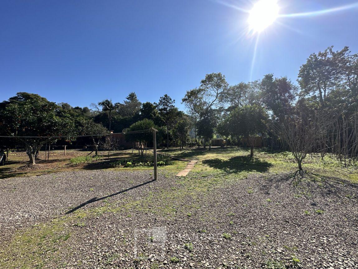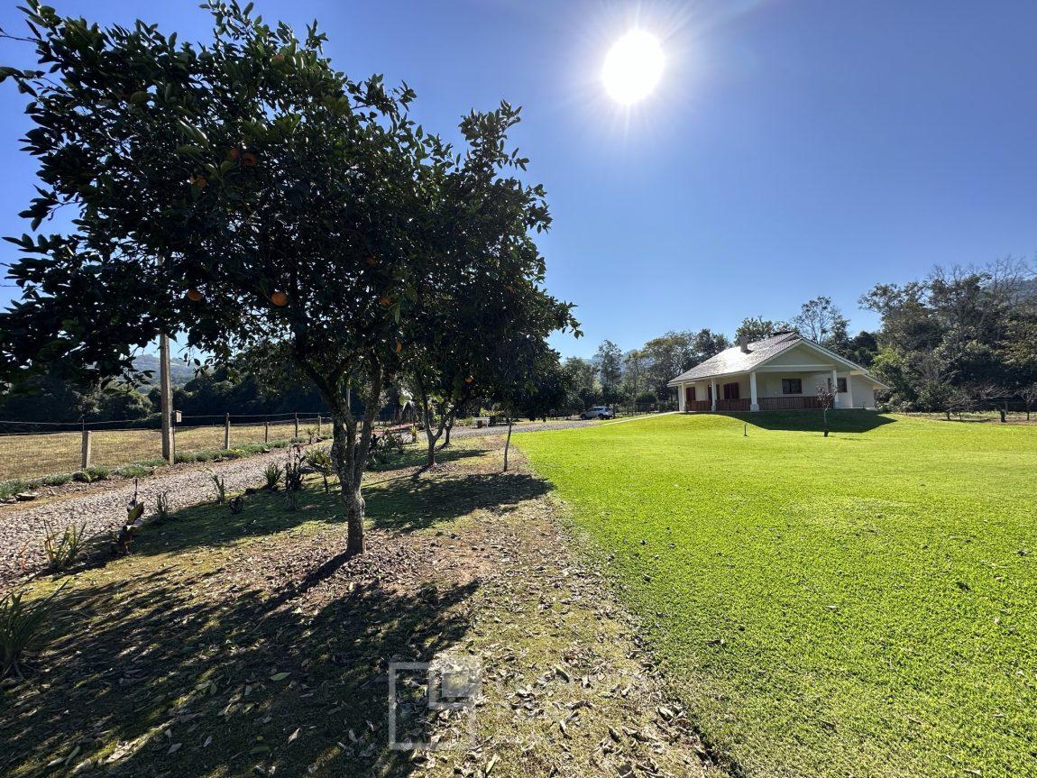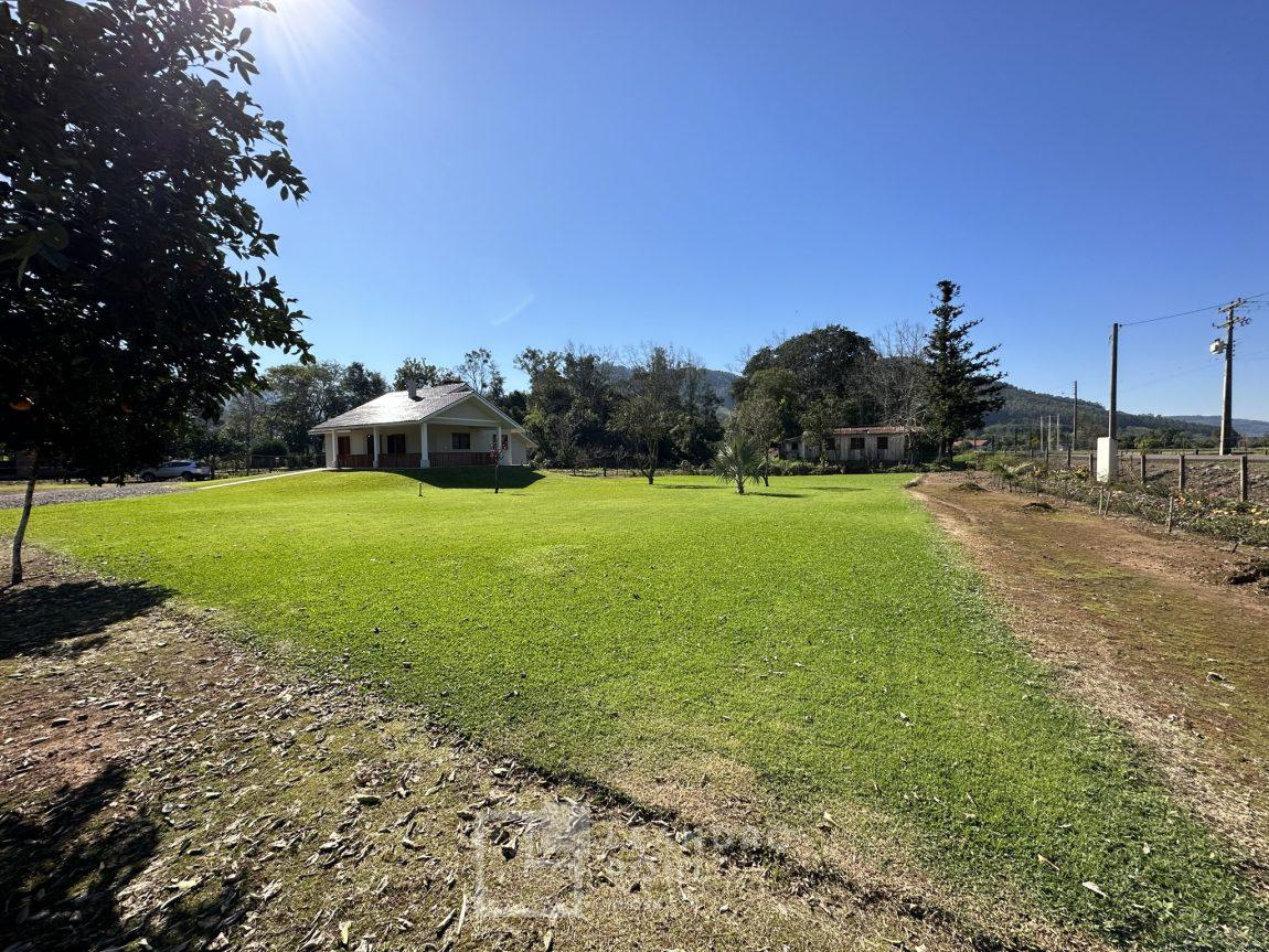 Temos uma bela casa residencial de alvenaria, plana com 2 dormitórios e demais ambientes, e mais uma casa auxiliar com 1 dormitório, banheiro, uma cozinha e uma varanda para festas, área cercada com portão eletrônico, com pomar de frutíferas, um pátio que parece mais um tapete verde, e o acesso até este sonho é todo asfaltado,