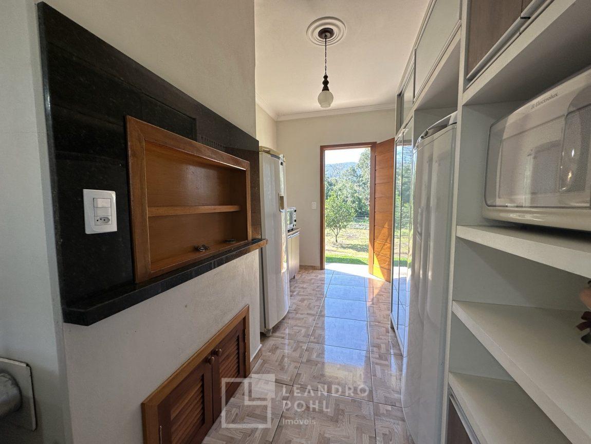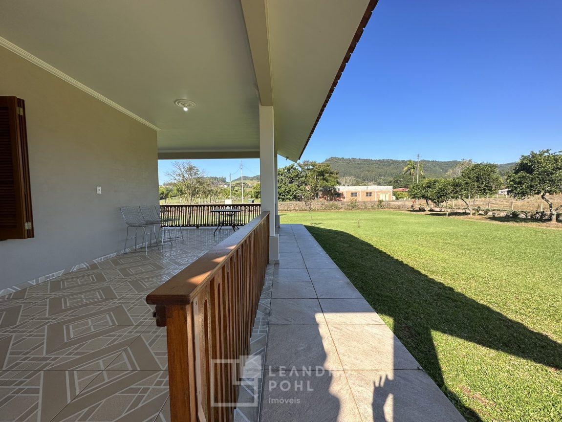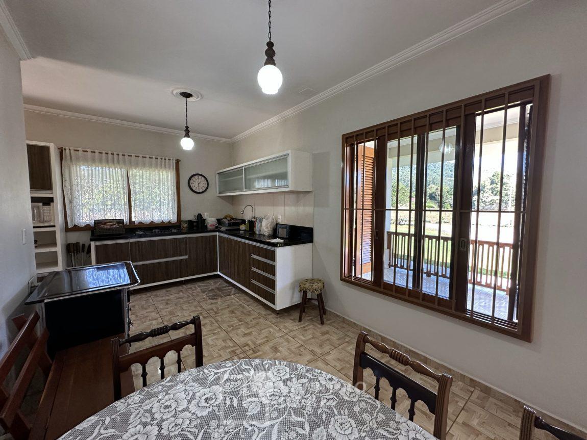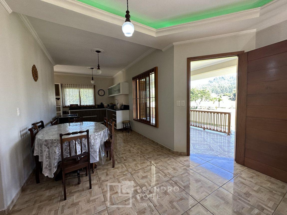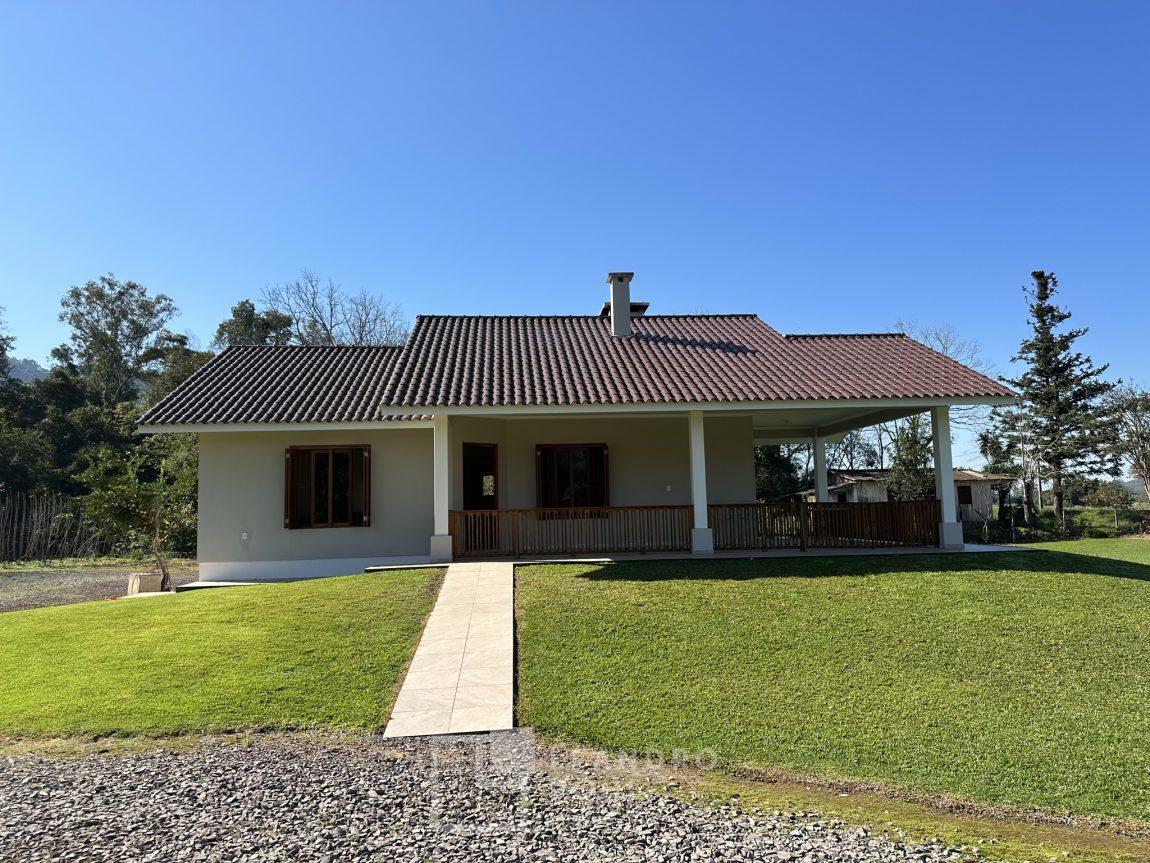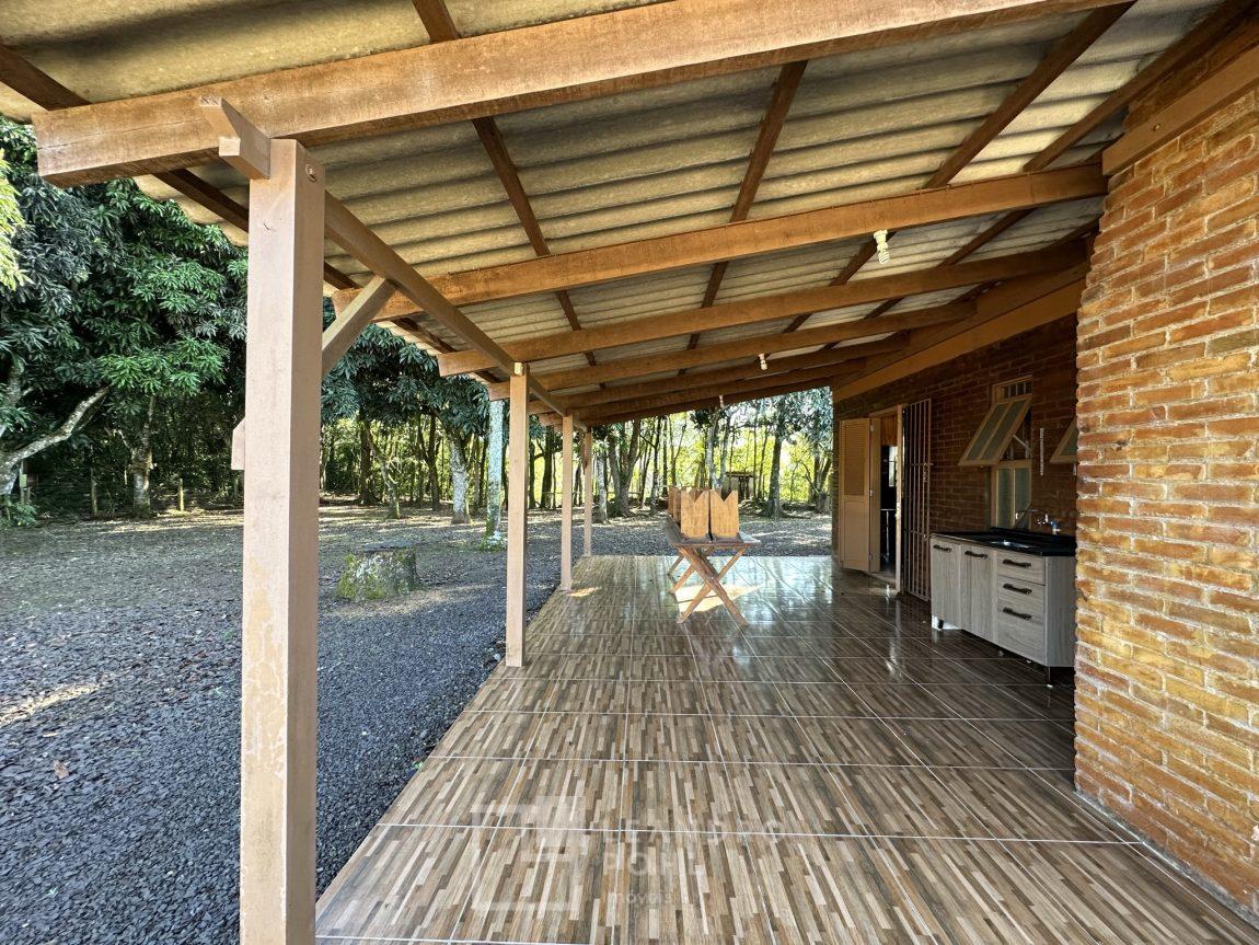 Temos uma bela casa residencial de alvenaria, plana com 2 dormitórios e demais ambientes, e mais uma casa auxiliar com 1 dormitório, banheiro, uma cozinha e uma varanda para festas, área cercada com portão eletrônico, com pomar de frutíferas, um pátio que parece mais um tapete verde, e o acesso até este sonho é todo asfaltado,