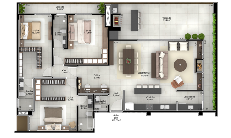 Alto padrão de acabamento, com hall de entrada e salão de festas mobiliados.