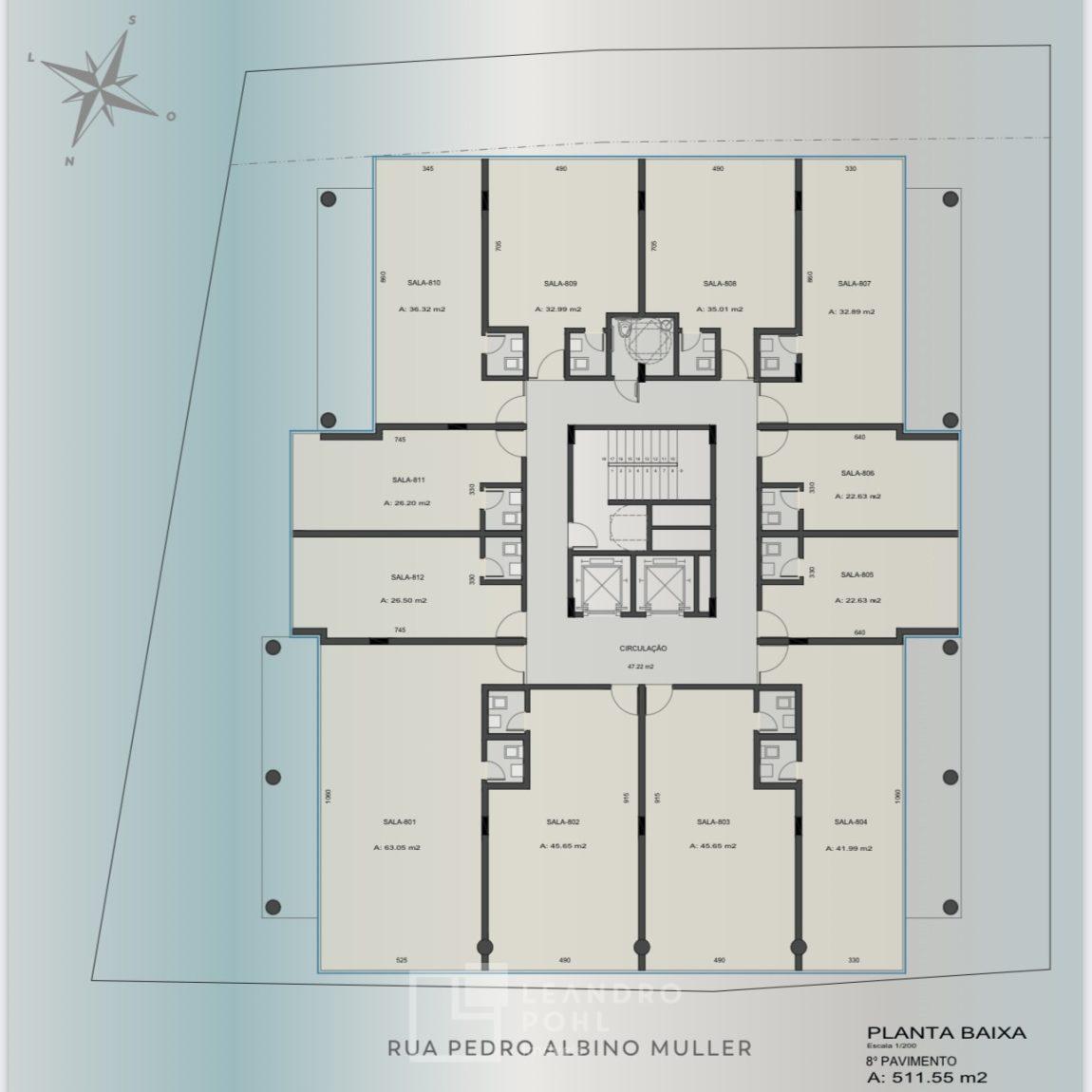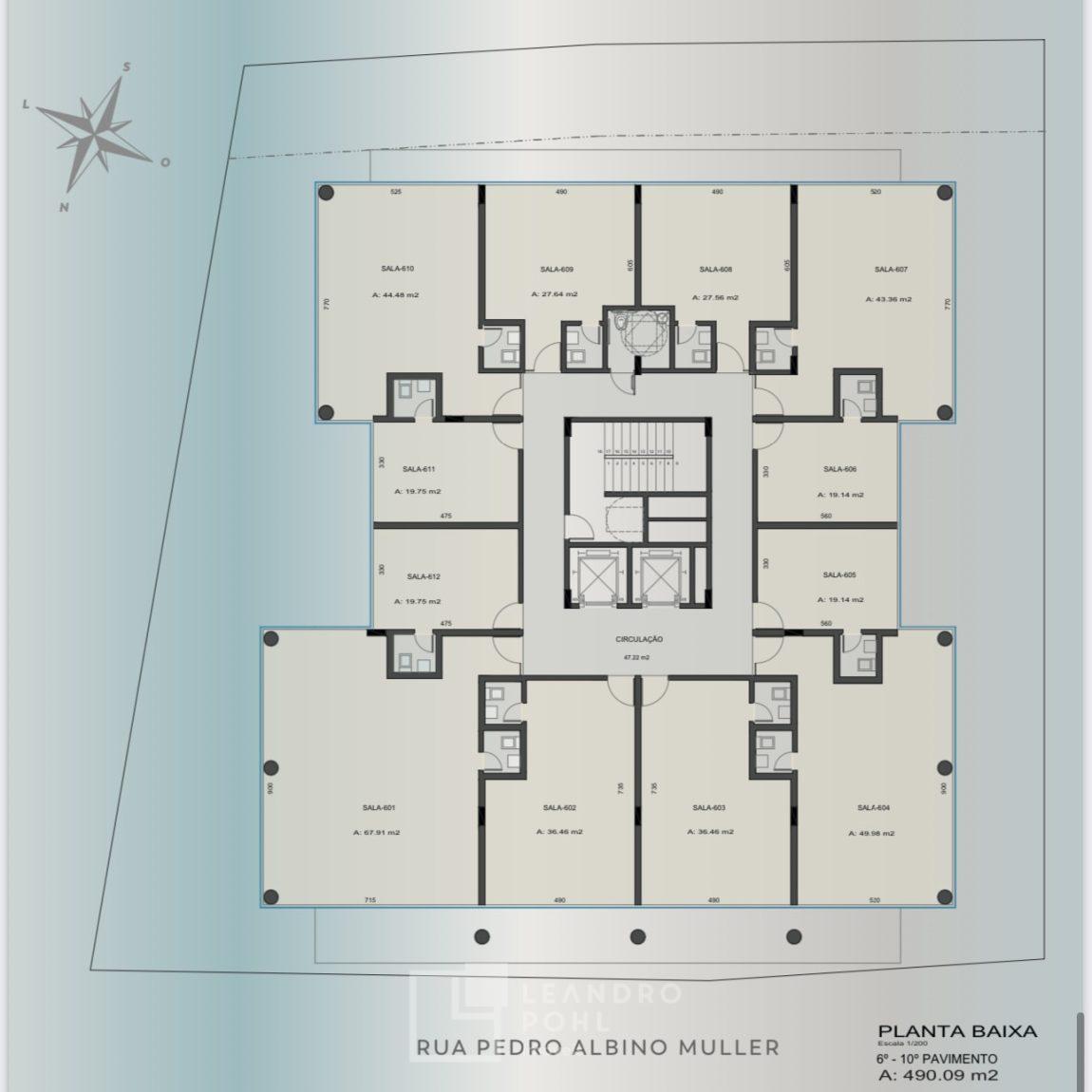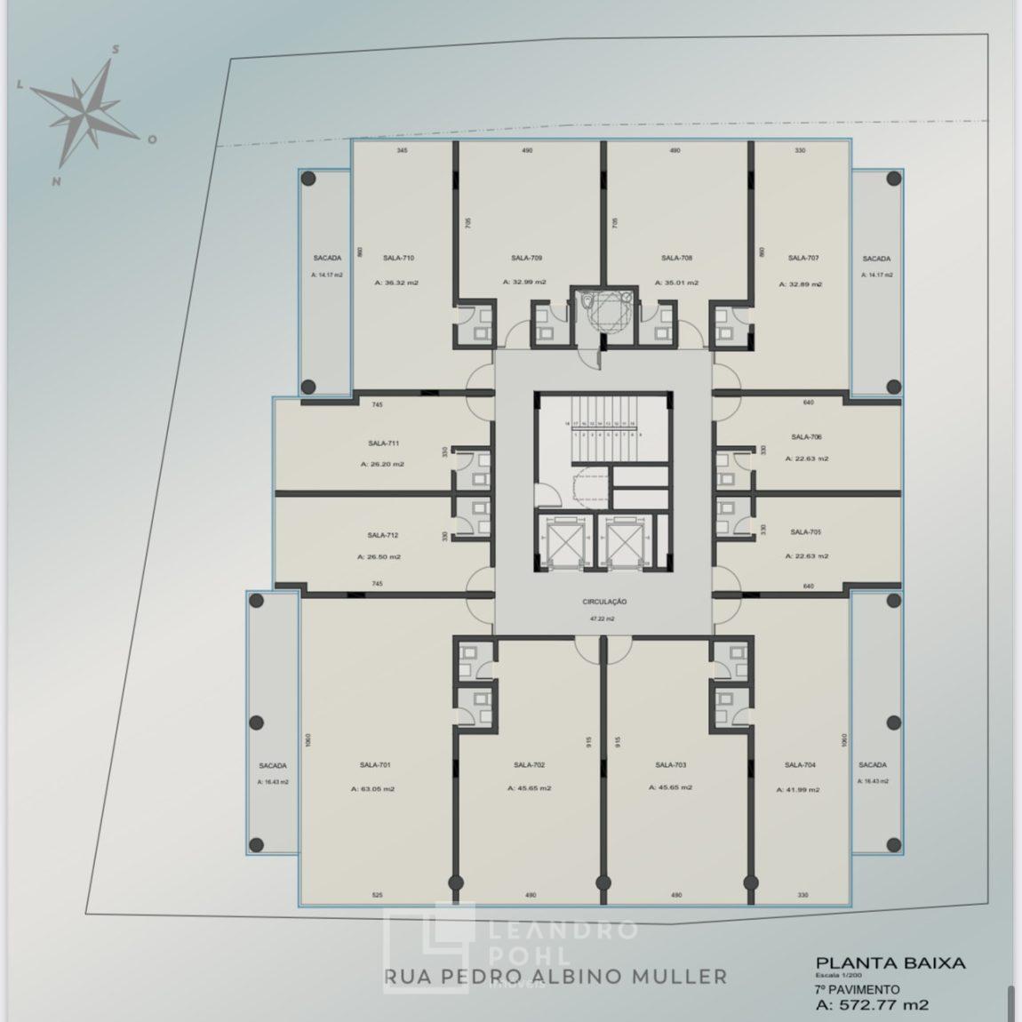 Salas comerciais de 18.87m² a 68.36m², piso porcelanato ou laminado, unidades com opção de sacada.