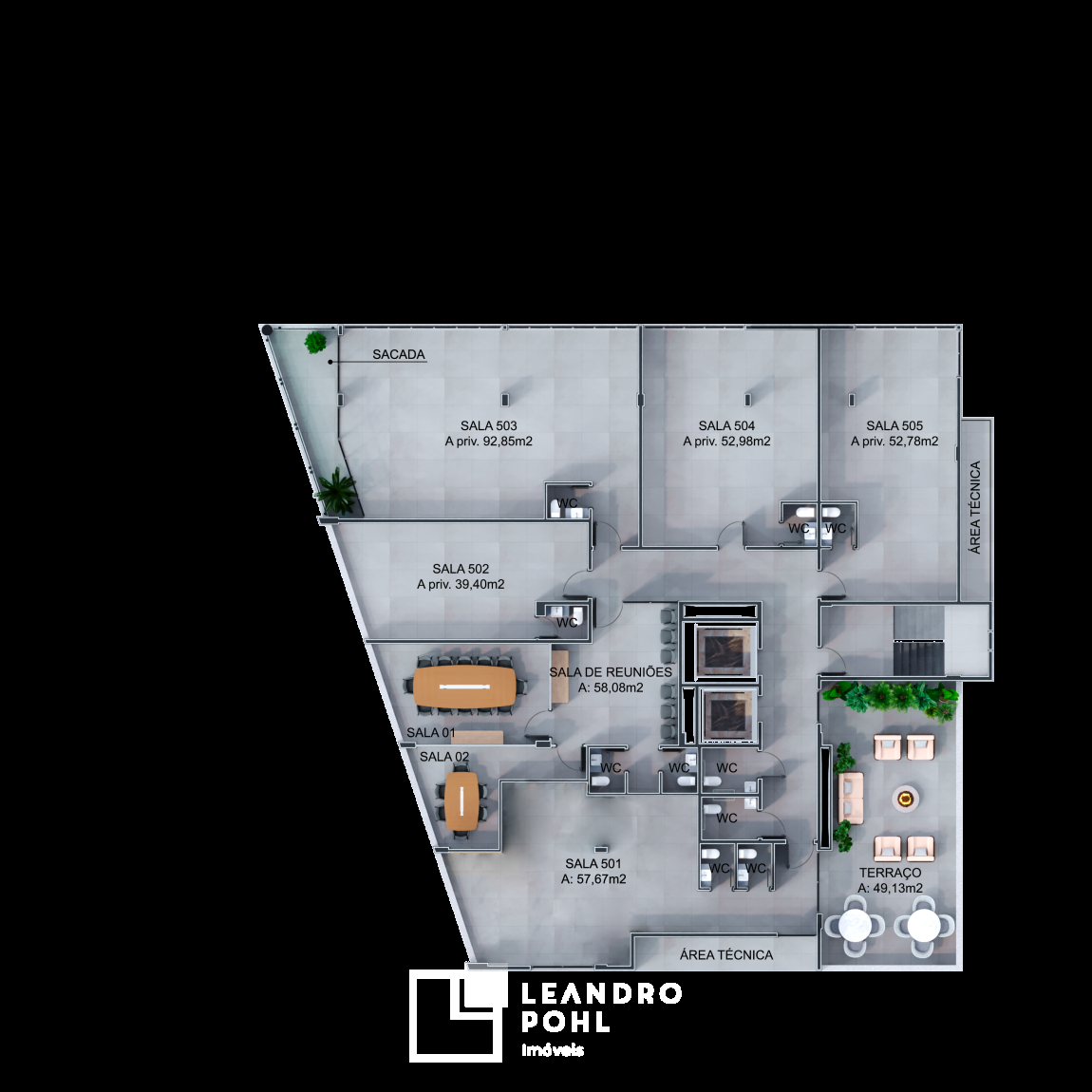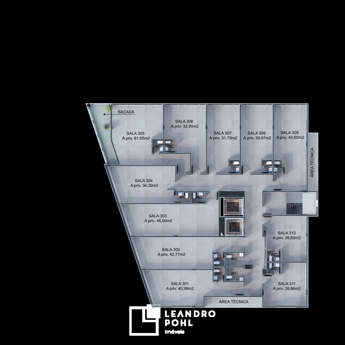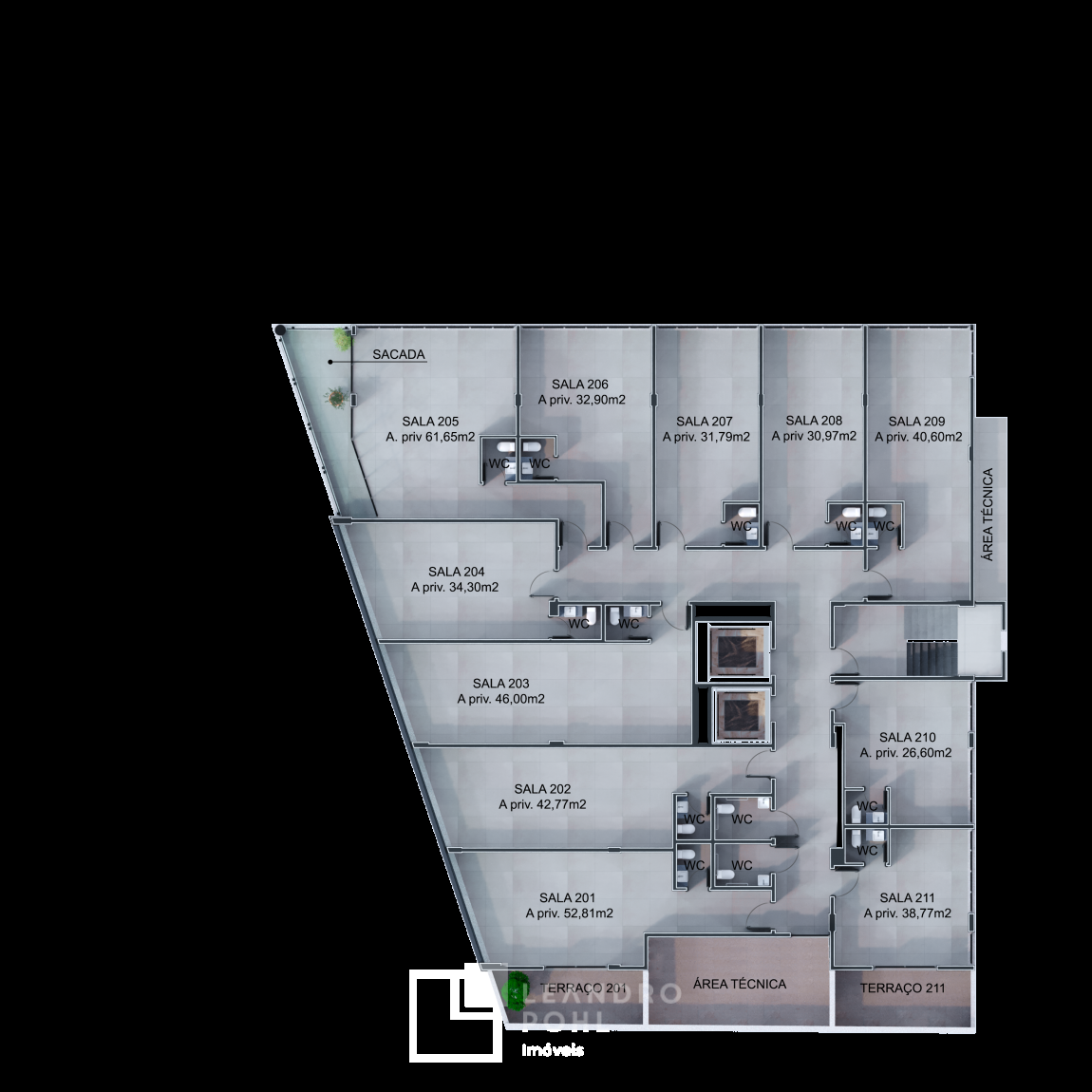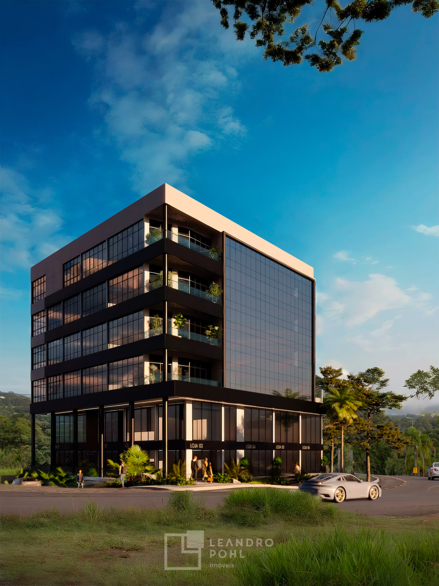 - 2 elevadores, Hall mobiliado, sala de reuniões mobiliada, 8 lojas, 19 boxes de estacionamento e 37 salas comercias.