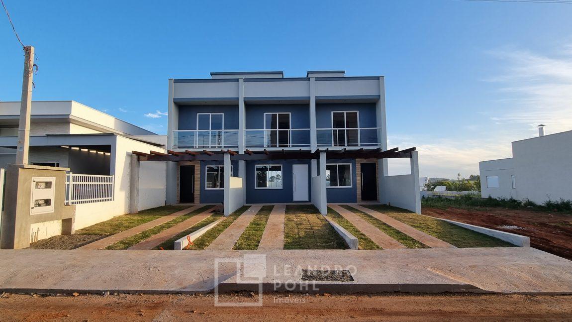 Sobrado 2 dormitórios, lavabo, piso cerâmico e laminado, churrasqueira, pátio nos fundos, abertura em alumínio.