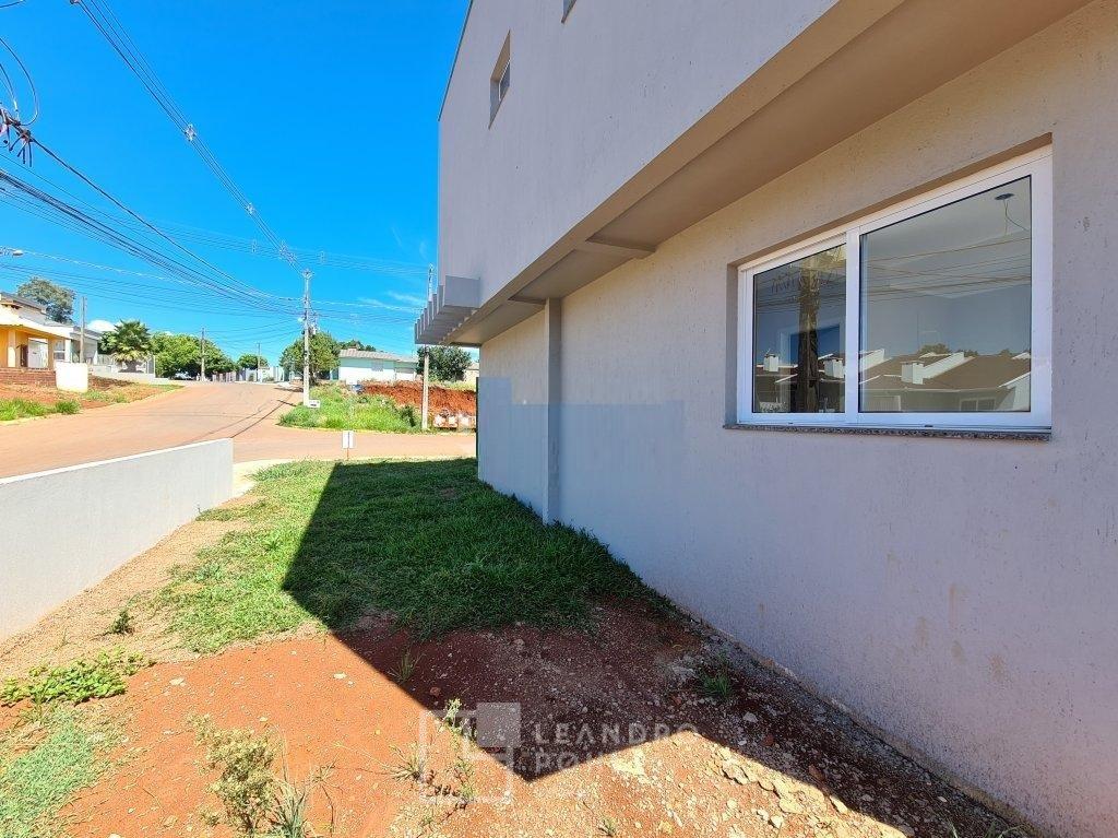 Sobrado de esquina, 2 suítes, sendo uma com sacada, piso laminado e porcelanato, churrasqueira, lavabo, garagem, pátio, novo, rua com calçamento.
