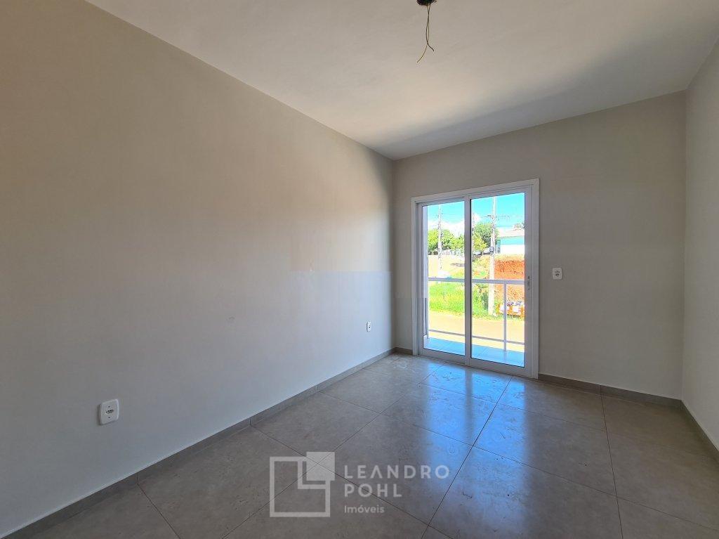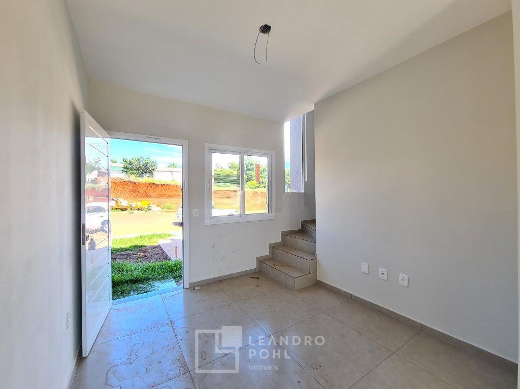 Sobrado de esquina, 2 dormitórios com sacada, piso laminado e porcelanato, lavabo, garagem, área/pátio nos fundos com churrasqueira, novo, rua com calçamento.