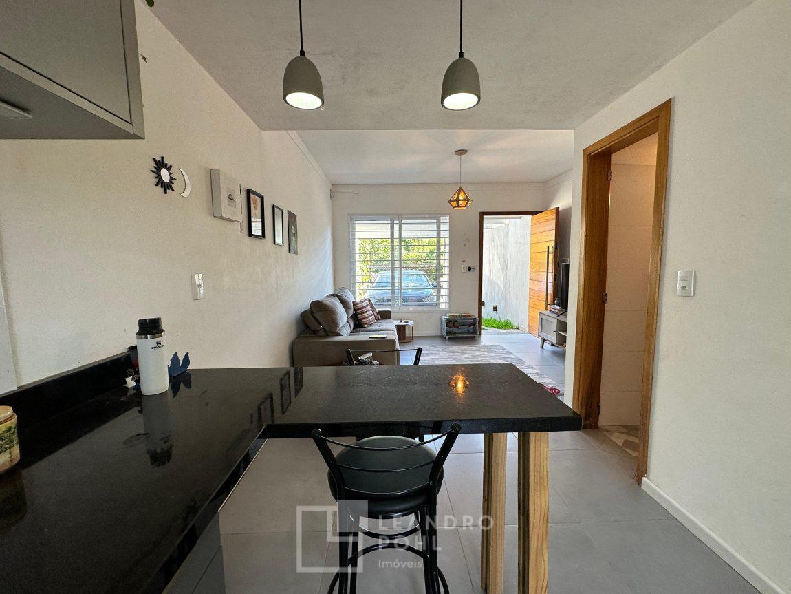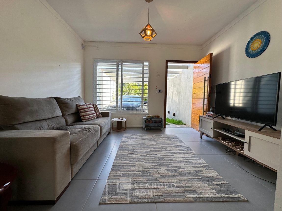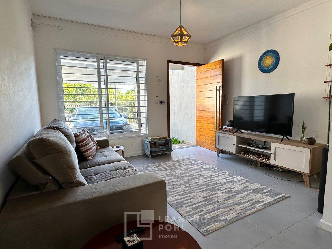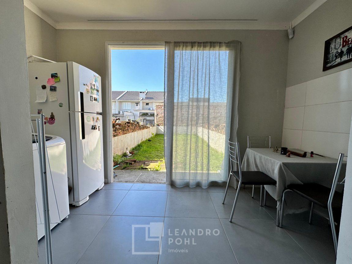 Sobrado 2 dormitórios, permanece móvel da cozinha e banheiro, cama e armários dos quartos, cozinha conjugada com a sala, lavabo, área de serviço, espera para lareira ou churrasqueira, gás central, pátio amplo nos fundos, pergolado em cimento na frente, orientação solar norte, cercado, portão eletrônico, piso porcelanato na área social e laminado nos dormitórios, IPTU 2025 pago, localização passível de enchente.