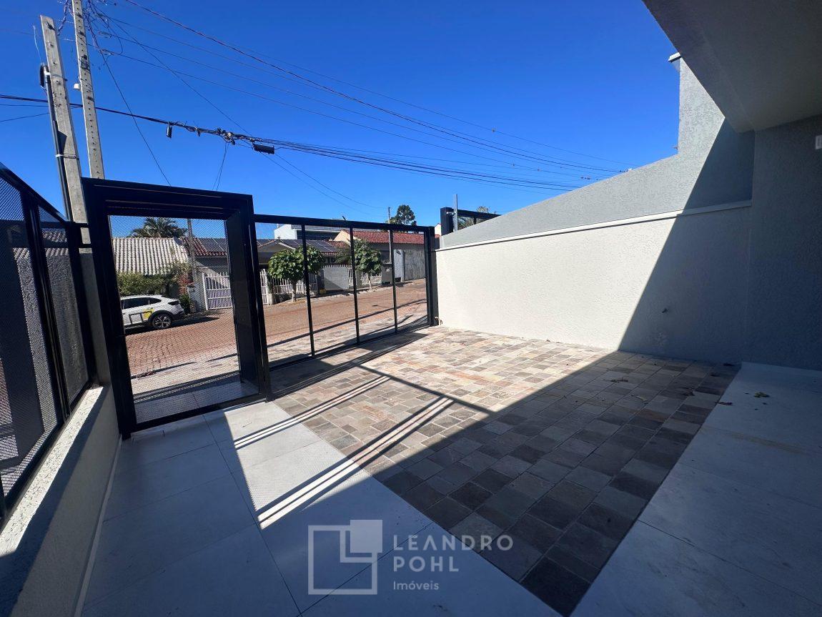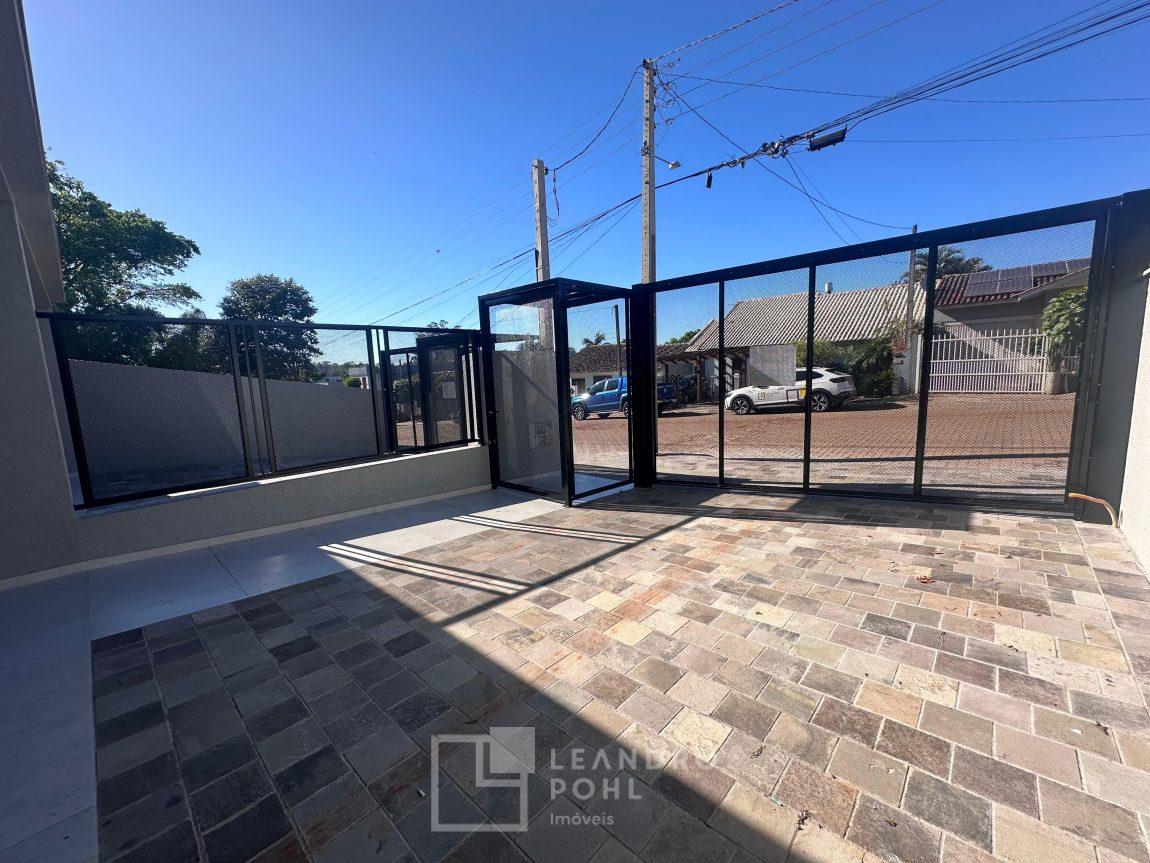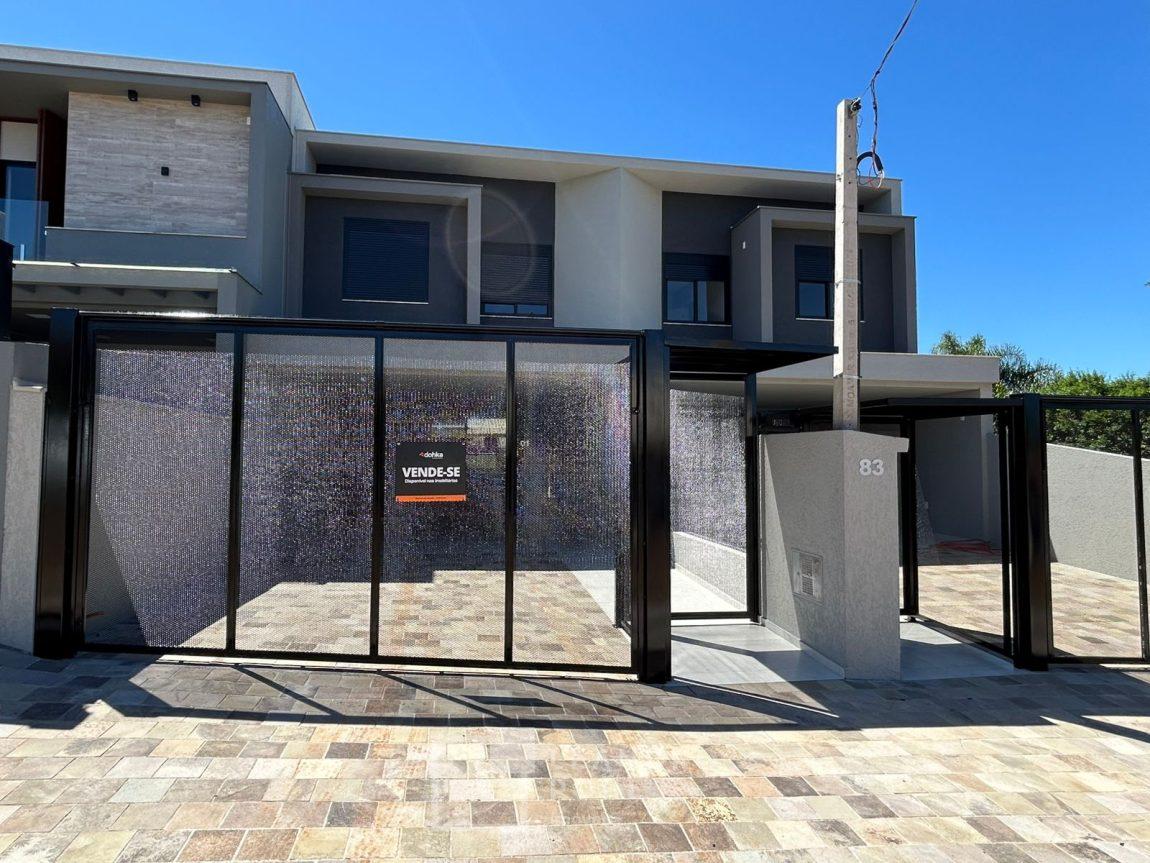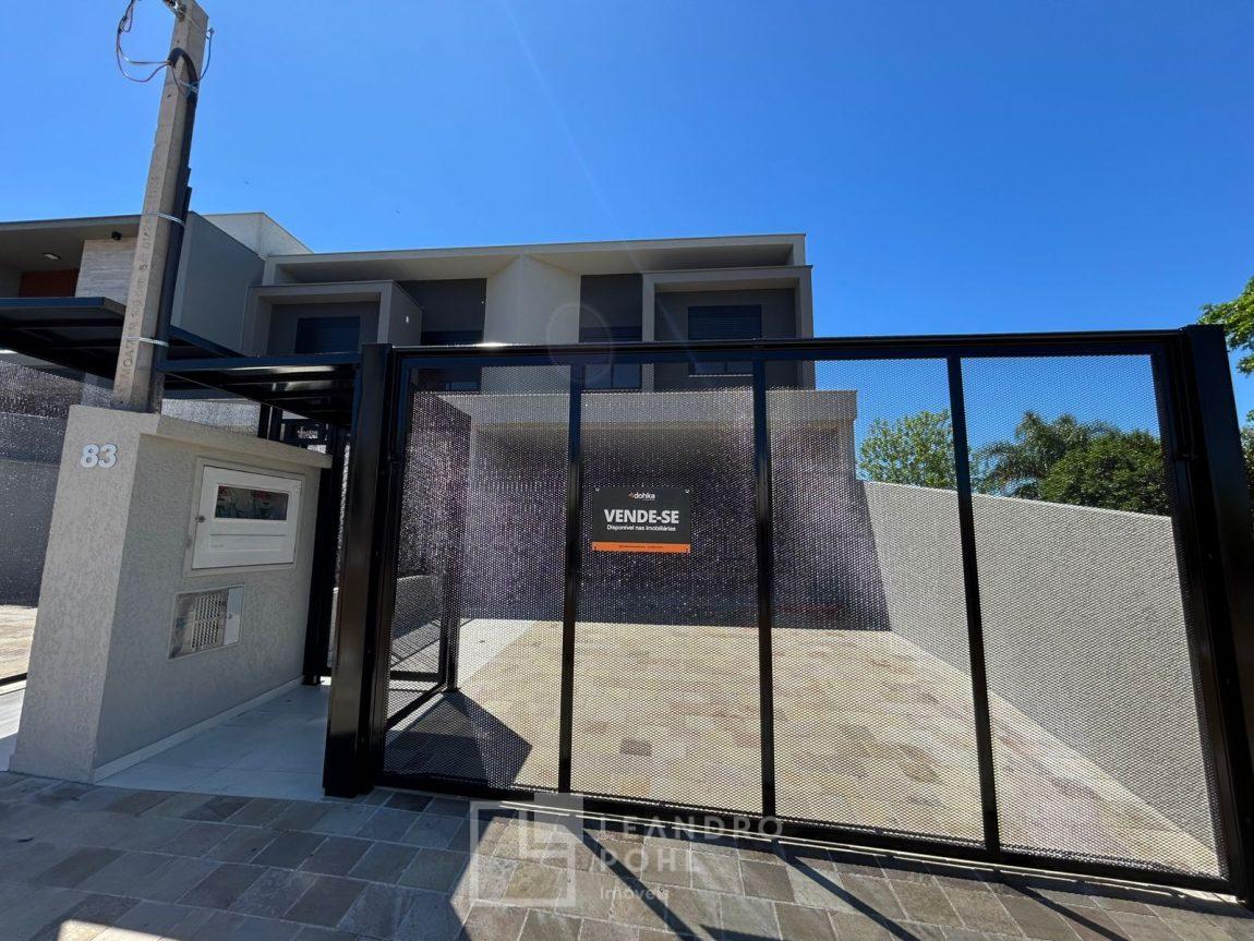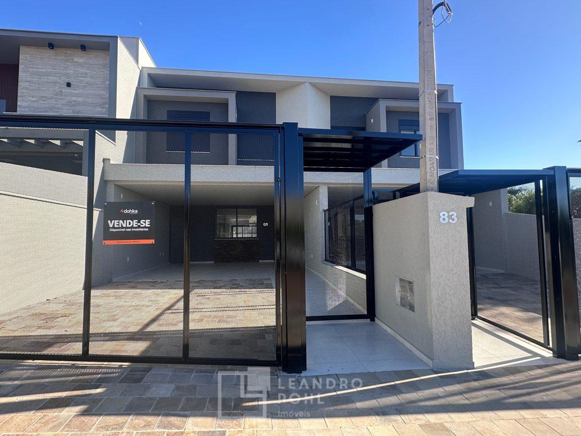 Sobrado de 3 dormitórios com suíte e sacada, living amplo, pátio frente e fundos, despensa, área se serviço separada, espera para split, espera para agua quente, calçada em basalto, lavabo, cercado e murado com vaga para dois carros, novo.