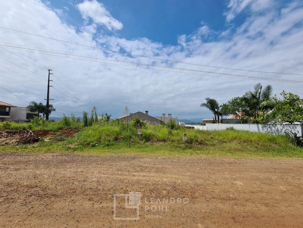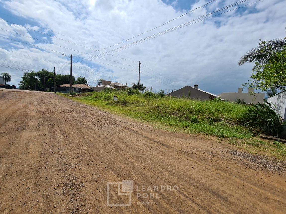 Amplo lote de esquina, plano, com frente de 20,50m em rua calçada, lateral sem pavimentação.